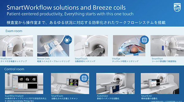 さらに,AIを活用した“SmartWorkflow Solution”が搭載された。ガントリ前面のタッチパネル“VitalScreen”やカメラとAI解析により正確な波形を得るタッチレス呼吸センサ“VitalEye”,シールド扉閉に連動して自動的に撮像を開始する“SmartStart”や患者ガイダンスを自動化する“AutoVoice”,スライスプランニングを自動で行うSmartExamなどの一連の機能により,検査室から操作室までのすべてのワークフローを効率化した。加えて,スライスプランの自動化やタスクガイダンスにより検査の80%を自動化し,より検査に集中できる操作環境をもたらす“MR Workspace”により高品質な診断結果を提供する。また,撮像の騒音を最大80%軽減する“ComforTone”や低反発マットレス“ComfortPlus Mattress”により患者の検査ストレスを軽減するなど,検査におけるスタッフと患者双方の快適性を追求している。廣瀬氏は,これらの性能に加え,定額でソフトウエアライセンスを使用可能なMR Subscriptionを紹介し,同社の最新MR装置をアピールした。
