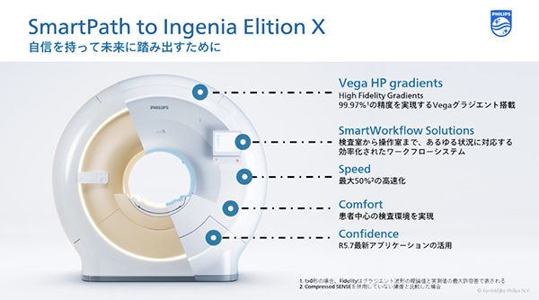 17,18日のVirtual Summitでは,「Elition Xアップグレードが可能とする臨床的インパクト」と題して,同社MRクリニカルサポートスペシャリストの栃本 剛氏がSmartPath to Ingenia Elition Xについて解説した。SmartPath to Ingenia Elition Xは,既存のIngenia 3.0Tをソフトウエアやコイルはそのままに,最上位機種Ingenia Elition Xへのアップグレードを行うプログラム。栃本氏は,同プログラムによるアップグレードの最大の特長として,「Vegaグラジエントシステム」の搭載を挙げた。Vegaグラジエントシステムは,新たな製造プロセスによる精密な設計で高精度なグラジエントシステムを実現。発熱や渦電流を抑制し,撮像時間の短縮や高空間分解能化,高SNRを可能にする。また,MR5300と同様にSmartWorkflow SolutionやComfortPlus Mattressも搭載され,ワークフローの効率化や患者負担の軽減を実現する。さらに栃本氏は,SmartPath to Ingenia Elition Xによるアップグレードは,Vegaグラジエントシステムによる臨床的メリットのみならず経営面でもメリットは大きいとし,「例えば,撮像の高速化により検査実施数を増やすことも可能で,新規にシステム購入を行うよりも高い投資効果が得られる」と述べた。また,Elition X 3.0Tを世界で初めて導入した医療法人幕内会山王台病院による臨床例も供覧され,同院院長の幕内幹男氏,診療放射線技師長の大津義弘氏,放射線科の野坂俊貴氏によるビデオメッセージも紹介された。