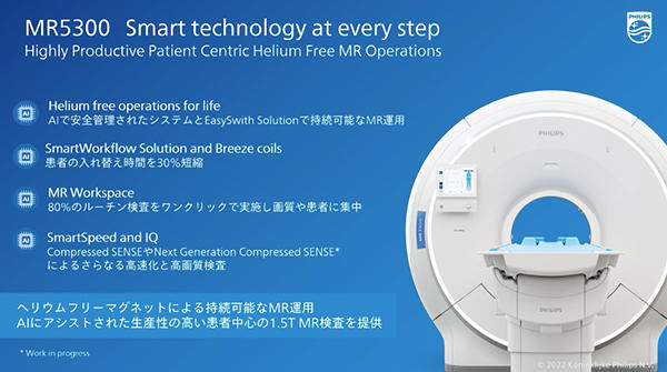 (株)フィリップス・ジャパンは,2022年3月にPhilips MR Virtual Summit2022を開催した。同社は,既存の3.0T MRI「Ingenia 3.0T」を3.0T最上位機種「Ingenia Elition X」にアップグレードが可能な“SmartPath to Ingenia Elition X”の提供を2021年9月に開始したほか,2022年3月1日(火)にはヘリウムフリーの新型1.5T MRI「MR5300」を発売。MR5300は,将来にわたりヘリウムフリーなMR運用を可能にし,人工知能(AI)を活用することで,患者中心の自動化されたワークフローや超高速検査,高品質の画像診断を実現する。Virtual Summitでは,10日(木),11日(金)にMR5300,17日(木),18日(金)にSmartPath to Ingenia Elition Xをテーマに,それぞれの概要や臨床的有用性の解説が行われ,Ingenia Elition Xの世界第1号機の導入事例について紹介された。