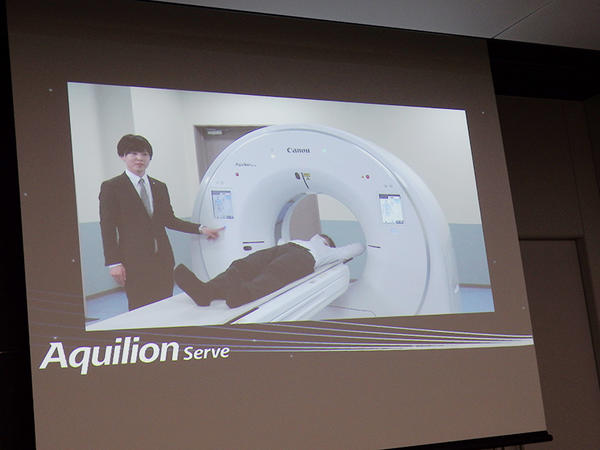 80列CTの新製品であるAquilion Serveは,CT検査の一連のワークフローである“ポジショニング”〜“スキャン計画”〜“画像表示”に自動化技術(Automatic Technology)を採用したのが特長の一つだ。中でもポジションニングは,ガントリに内蔵されたカメラを活用して寝台に寝た患者の体位を検出し,最適なポジショニング位置を自動で算出する。これもガントリに内蔵されたタッチパネルで部位を選択し,MOVEボタンを押すだけでポジショニングが完了する(Automatic Camera Positioning)。ガントリ内蔵カメラはキヤノン製のカメラが採用されている。Aquilion Serveの開発では,設計段階からキヤノンとともに装置デザインや機能の考案を共同で進められてきたという。説明会では,栃木県那須のキヤノンメディカルシステムズ本社と中継を結んで実際の製品を使ってAutomatic Camera Positioningや,スキャン計画を自動化する“Automatic Scan Planning”を実演を交えて紹介した。