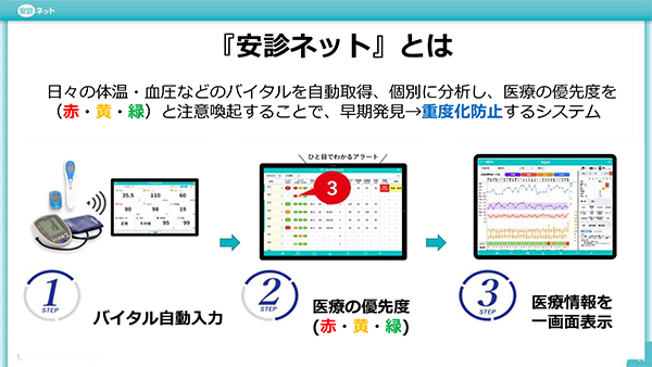 安診ネットは,自動取得した日々の個々人のバイタルを人工知能(AI)が分析し,医療の優先度を注意喚起することで早期発見・重度化防止するICT健康管理システムで,介護施設や病院,在宅医療などさまざまなシーンで活用されている。LIFEへの対応として,従来から実績のあるAI健康管理で重度化防止を支援することに加え,自立支援を促すための業務サポート機能を新たに搭載した。業務サポート機能は,介護職やケアマネジャーだけでなく,リハビリ職や栄養士,看護師,医師など各専門職専用のシステムを実装することで業務負担を軽減することに加え,システムを運用することで利用者のリスクや状態変化を職種間で共有でき,自立支援・重度化防止のアウトカムを出すためのPDCAを回すことができる仕組みとなっている。