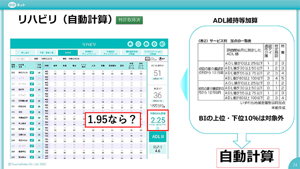 発表会では,芙蓉グループ代表で安診ネット事業部責任者の前田俊輔氏が,安診ネットLIFE対応の概要や業務サポートの事例を紹介した。前田氏は,「科学的介護の導入で,利用者の状態を改善すると報酬が下がるという矛盾が改善されようとしている」と述べ,同システムを活用することでLIFEのフィードバックに対して有効な対策を打つことができ,LIFE加算による収入アップを期待できると紹介した。