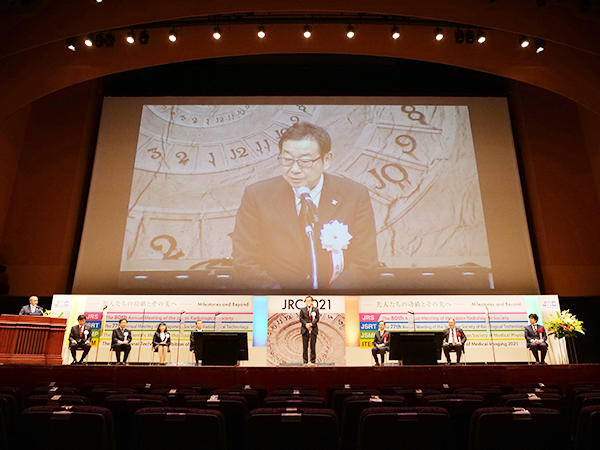 続く合同会員セレモニーでは,まず次回JRC2022の会長・大会長が挨拶した。第81回JRS総会会長は村上卓道氏(神戸大学),第78回JSRT総会学術大会大会長は白石順二氏(熊本大学),第123回JSMP学術大会大会長は西尾禎治氏(大阪大学)が務める。開会日程は2022年4月14日(木)〜17日(日)(ITEMは15日から)となった。合同会員セレモニーの壇上に立った村上氏は,「未来への潮流と変革(Radiology—A key for the paradigm shift)」という次回のテーマを紹介。プログラムの準備を進めており,オンサイトメインにWebと組み合わせたハイブリッド形式で開催したいと述べた。