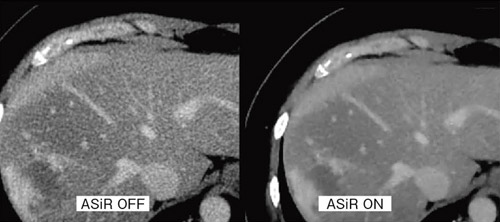 BMIが高かったり,あるいは除脂肪体重の多い被検者,低電流小児撮影など,日常,画像ノイズが増加し良好なコントラストがつかないケースがあるが,このような場合はX線管電流条件を上げることでリカバリーが可能である。しかし,X線管照射性能制限や被ばく抑制の面で,選択肢として簡単に選ぶことができない。ASiRを用いると,従来のX線管電流条件のままでノイズが30〜50%低減され,被ばくを増加させることなく擬似的に約2倍のX線管電流をアップさせた時と同じ低ノイズレベルの画質が得られる。