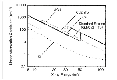 GEが採用しているX線検出素子CsIにもIが含まれていることから,K-吸収端33keVより高いX線に対して高い感度を有する(図4)。一般的に,乳房撮影装置で使用される検出器は,15〜25keVのX線に対する特性を重視しているため,33keV以上のX線に対しては十分な感度が確保しにい。Iを含まない検出素子では,より大きな管電流が必要となり,結果的に被ばく量を増加させてしまう。CESMが,低エネルギーと高エネルギーのX線を2回照射しても,被ばく量が通常のマンモグラフィの1.2〜1.5倍程度に収められる理由はここにある。