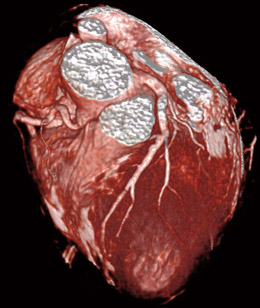 一般的に壁運動評価から機能評価,冠動脈撮像までには約1時間という検査時間を要します。検査時間の短縮のために,高倍速SENSE対応の32ch Cardiac Coilを研究中です。これにより,Whole Heart MRCA(図2)を約4分で撮像することが可能になります。