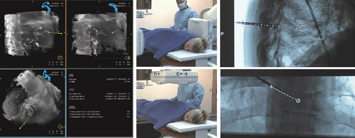 CTによる3D画像上で計画した誘導予定パス(直線)のグラフィックと,透視ライブ像上とをリアルタイムで重ね合わせることにより,透視下での三次元的なガイディングを可能にする。角度や深さの制限がなく,肋骨等のアーチファクトの影響が少ないため,バイオプシー,RFA,椎体形成術などの非血管系IVRに有用である(図1)。