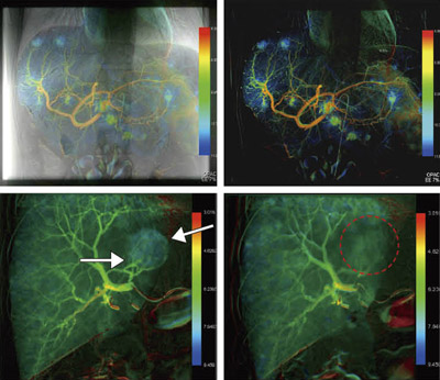 2D連続撮影データから造影剤のピーク到達時間を算出し,カラーマップを作成する。腫瘍へ至る血管の同定や,治療前と治療後での血流速度の違いを把握することができる。 |