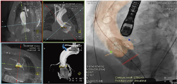 syngo DynaCT画像データを透視画像上へ直接投影させることで,3Dロードマッピング機能を提供する。従来は脳血管内治療で用いられることが多かったが,近年では欧米を中心に,分枝型のステントグラフトや人工心臓弁の留置計画用として利用されることが増えてきた |