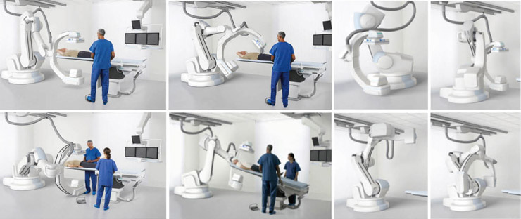 また,Hybrid OR などのように手術室に設置する場合には,多様なスタンバイポジションにより外科手術用のワークスペースを確保しやすく,必要に応じて透視や回転撮影を簡単に施行できるなど,ポジション間の迅速な移行が画像情報のリアルタイム性と精度を高めるのに貢献します。さらに,救急部門においても,多軸方式の特長を生かした,多目的撮影装置としての使用が検討され始めています。