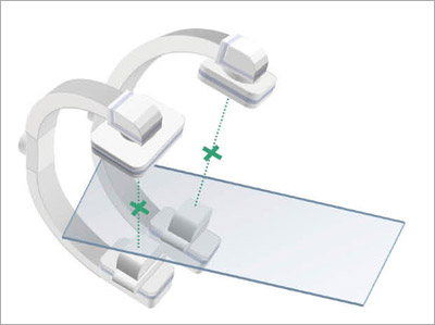 第2の利点は,アイソセンターをアームの動きだけで任意に設定できる点です。寝台を動かすことなく視野や投影方向を設定できるため,被検者中心の治療環境を実現できます。また,アイソセンターに対するX線ビームの相対位置も変えられるため,撮影時の軌道バリエーションが広がります。
