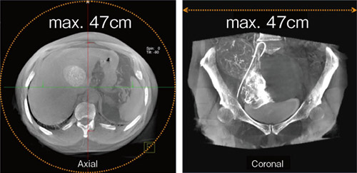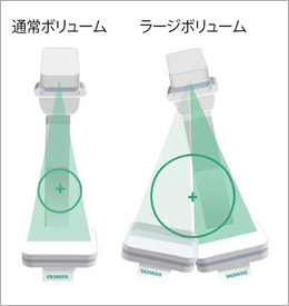前述のFISによる偏心回転軌道を活用した撮影機能です。DynaCTデータ収集時の回転撮影を2回に分け,アイソセンターに対する検出器の相対位置を交互にオフセットさせることで,より広い断面の再構成を実現します(図4)。このとき,長方形の検出器を体軸に対して縦方向にセットすれば,断面積だけでなく体軸方向の撮影範囲も拡大できるため,腹部・胸部を中心とした体幹部でのDynaCT撮影時に威力を発揮すると考えています。(図5) |