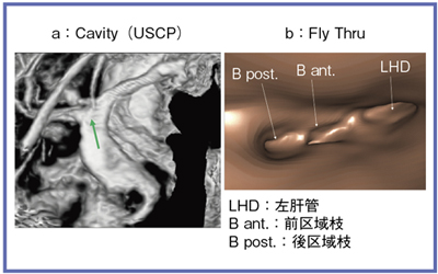 図1 症例1:胆管拡張,肝管合流部のCavity(USCP)(a)とFly Thru(b)