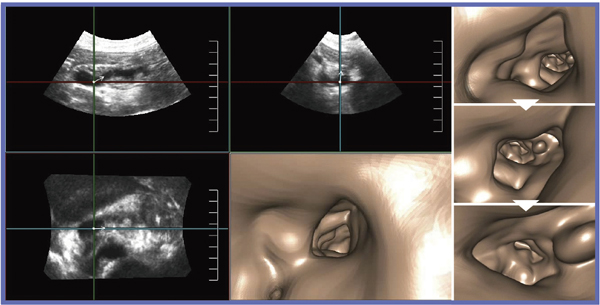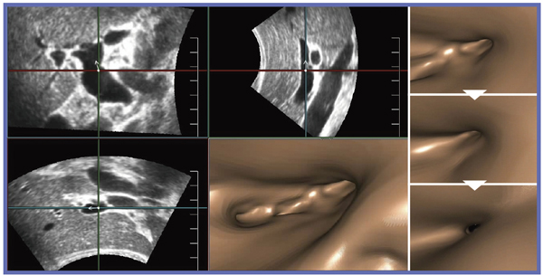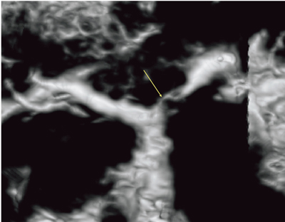 Cavity(USCP)で肝門部を中心に再構成した画像では,左肝管の根部の狭小化が確認できた(図4)。Fly Thruでは,下部胆管から肝門部に向かって視点を移動させ,肝管合流部から左肝管,前区域枝,後区域枝に入ろうとすると,左肝管は狭くなって入りにくい部分があり,しかし,そこを抜けると開けて管腔が認識できる(図5)。一方で,前区域枝には入れず,後区域枝には入ることができた。Bモードで狭くなっていた部分は,Fly Thruでは内腔の認識ができなかったと考えられる。管腔臓器を外から見るCavity(USCP)と,中から観察するFly Thruの両方を使うことで,新しい情報が得られると考えられる。