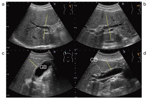 Bモード画像で,膵全体の腫大と低エコー化,膵体部に狭小化した主膵管を認め,自己免疫性膵炎と診断した。胆管をBモード画像で確認したところ,左右肝管合流部から左肝管に向かう部分に壁の肥厚像と狭窄を認めた。また,胆嚢全体の壁肥厚像を認めた。さらに,肝外胆管も拡張しており,これは膵頭部腫大のためと考えた。これらの所見よりIgG4関連の硬化性胆管炎と診断した(図3)。