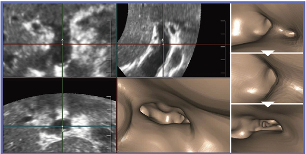 Fly Thruは,3Dプローブで得られる超音波のボリュームデータから管腔の内腔面を再構成する仮想内視鏡的表示法で,管腔内を飛行するように観察するという意味で“Fly Thru”と名付けられた。胆膵領域の三次元画像表示法としては,超音波のボリュームデータからネガ/ポジ反転して,管腔臓器の構造を三次元再構成表示するCavity法が以前から行われてきた。われわれは,この技術を用いて胆管,膵管の描出を行うUSCP(US cholangiopancreatography)を提唱している。胆膵系のCavity(USCP)とFly Thruをあわせて提示して,超音波による“内”と“外”の3D画像について検証する。