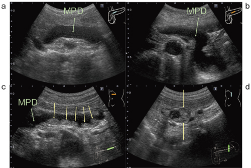 IPMN(膵管内乳頭粘液性腫瘍)の症例である。主膵管は体部から尾部にかけて拡張しており,Bモード画像でも主膵管の尾側端に複数の乳頭状の腫瘤を確認でき,主膵管型IPMMと診断した(図6c↓)。短軸方向でみると内腔面が狭くなり,乳頭状の腫瘍が内腔に張り出していることがわかる(図6d↓)。