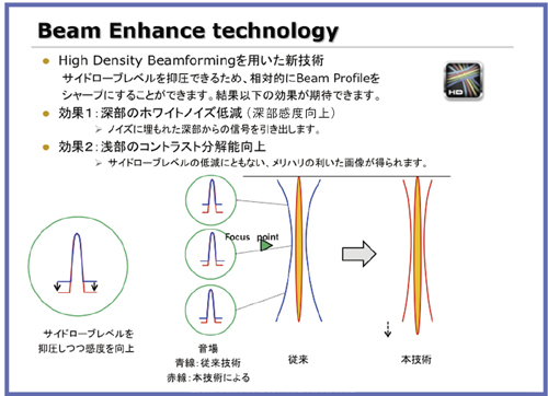 Beam Enhance Technologyは,超音波ビームのサイドローブを抑制することで,深部感度を向上させ,浅部のコントラスト分解能を上げる新しい技術である。近位部ではサイドローブを低減することでアーチファクトを減らし,遠位部では感度を向上してホワイトノイズを軽減する(図9)。