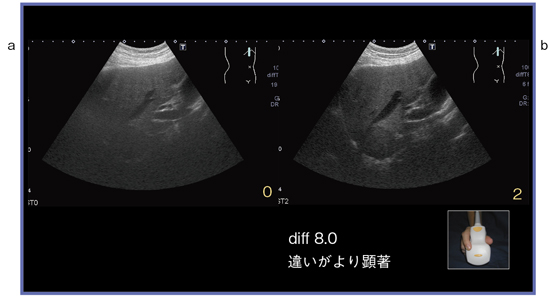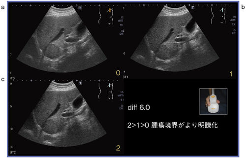 S1に大腸がんの転移性腫瘍(35mm)を認める。図10のBモード画像右下の数字はBeam Enhance Technologyの適用レベルを示す。0(適用なし)〜4の5段階を選択可能である。レベル3,4ではフレームレートが下がる傾向がある。図10は,PVT-674BT/differential6.0のコンベックスプローブによるBeam Enhance Technologyである。適用なし(a)に比べてレベル1(b)と2(c)では,腫瘍の境界がより明瞭に描出され,輪郭不整像を示していることがわかる。また,腫瘍より深部の構造物もより明瞭に描出されている。differential8.0では,適用なし(a)に比べて,レベル2(b)では腫瘍の認識が容易である。明らかな違いを認識することができる(図11)。