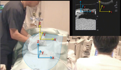 ![]() 図1 Smart Registrationの1ステップ 磁場の中に置かれた被検者の躯幹を使って, CTのボリュームデータと超音波プローブの軸を合わせる。 |