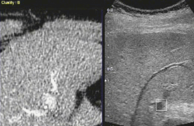 まず,ソナゾイドによる造影超音波を行うが,Aplio500では造影性能も向上しており,空間分解能も高く,肝臓の浅いところから深いところまで均一な,コントラスト分解能の良い造影像が得られている。フュージョンすると,CTの動脈相とよく一致した所見で,腫瘍の範囲がさらに明瞭になる(図3)。