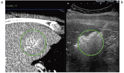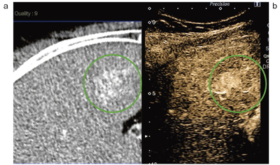 ![]() 図6 RFA治療直後のソナゾイド造影超音波画像(b) 治療前の焼灼予定範囲(aおよびbの緑の円)と 治療後の実際の治療域の関係がよくわかる(b)。 |
