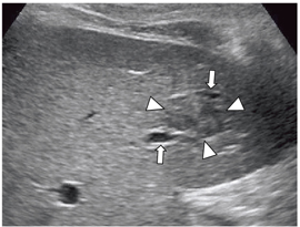 ![]() 図8 肝内門脈腫瘍栓の有無は高画質Bモード画像でも診断は困難 腫瘍(←で囲まれる)の近傍を走行する門脈枝(↑)は 蛇行するため内腔の描出が困難である。 |