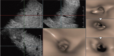 東芝メディカルシステムズの超音波診断装置のメカニカル4Dプローブには,腹部用のコンベックスとマイクロコンベックス,乳腺,甲状腺,体表用のリニアをメカニカルに振るもの,経直腸,経膣用があるが,これらすべてでFly Thruが可能である(図7)。Fly Thruは,シングルスイープでボリュームデータを取得し,そのボリュームデータから"High Density Rendering"という高速画像取得・演算を行う。簡単で高速なボリューム操作を実現する新しいエンジンで画像処理を行うことで,高画質のデータを最大限に生かした透視投影像を再構成する。