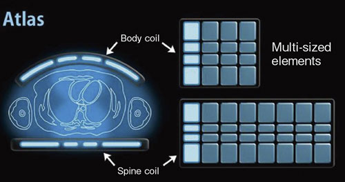 Atlas SPEEDERは,多数のコイルを配列した単純なマルチチャンネルコイルではない。検査部位に合わせてコイルのサイズが最適化されている。脊椎用コイル,腹部用コイルともに中央列のエレメントのサイズが小さく設計され,これにより腹部の深い領域にてSNRが向上するように設計されている(図1)。