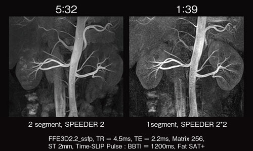 腹部非造影MRAの撮像を例にとってみよう。基本となる呼吸同期を用いた3D撮像では,撮像時間が呼吸回数に依存するため,たとえフェイズエンコード方向にSPEEDERを適応しても撮像時間は短縮されない。しかし,ここでスライス方向にSPEEDERを適応すれば,撮像時間を大幅に短縮できる。図2は,最新の非造影MRA撮像法であるTime-SLIP法において,腎動脈撮像にスライス方向のSPEEDERを適応した例である。収集を1セグメントにし,スライス方向のSPEEDERを適応することで撮像時間を約1/3に短縮して,1分30秒前後で撮像を終了できる。