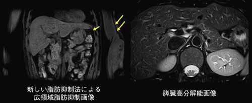 息止め撮像のパフォーマンス向上のために,フェイズエンコード方向とスライス方向のSPEEDERを同時に使用し,より高分解能で,より短時間の息止め検査を可能にする。新しい脂肪抑制技術によって,磁場不均一が発生しやすい胃や脾臓の周辺,また腕と躯幹部の間でも,より高いレベルの脂肪抑制効果を得ることができる。また,呼吸性の細かな動きのアーチファクトを低減することで,ルーチン画像の安定化のみならず,膵臓など各臓器の局所高分解能撮像の実現をめざしている(図3)。