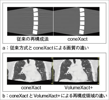 これに対し東芝は,新たな画像再構成手法であるconeXactを開発し,320列撮影でもアーチファクトの少ない画像を再構成することを可能にした(図1 a)。そして今回,さらに画像化できる領域を拡張したVolumeXact+を新たに実装した。これによりconeXactでも対応しきれなかった画像再構成範囲の制限が劇的に低減された(図1 b)。