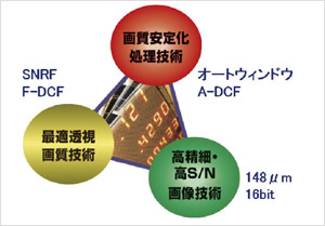 PureBrainは,高精細・高S/N画像技術,画像安定化処理技術,最適透視画質技術を融合し,最小の操作で,被写体に依存しない安定した画質と,低線量での高画質を提供している(図4)。