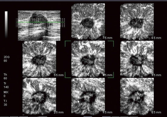 高周波4Dプローブを使ってボリュームスキャンを行い,直交3断面や一定スライス間隔の複数断面(MultiView)が表示可能なほか,体表に水平な断面像(Cモード)を観察可能です。さらに,ボリュームデータをポジネガ反転して構築するCavityモードにより,乳管の走行や嚢胞の形状がより把握しやすくなります。 |