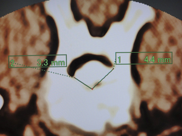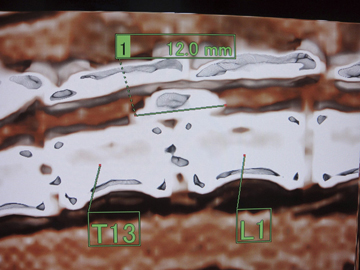 三次元CT検査は,手術計画を立てるにあたり,脊柱管内に逸脱した変性椎間板物質の詳細な情報を得るのに最良の検査方法の一つである。矢状断像での頭尾側方向への変性椎間板物質拡散範囲(図1),横断像での変性椎間板物質の左右方向への逸脱割合(図2),脊柱管背側方向への変性椎間板物質拡散範囲(図3),変性椎間板物質最大逸脱部位における脊髄圧迫の程度(図4),仮想内視鏡像での逸脱変性椎間板物質の形状(図5〜7)など多くの情報が得られる。