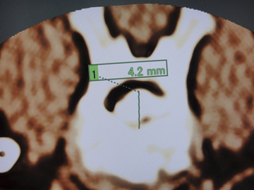 ![]() 図6 仮想内視鏡 第1胸椎脊柱管中央部より頭側を撮影 |
