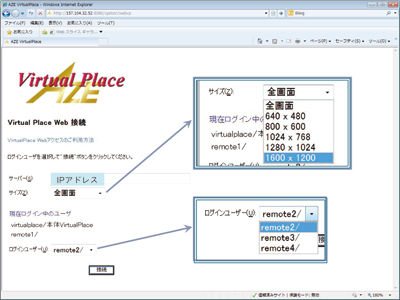図1 VPログインサイト VPの起動画面サイズ選択し,ログインユーザーを選択した後,接続ボタンを押すとログインできる。このとき,ログイン中のユーザーが表示されており,最大同時はWS本体含め5台である。