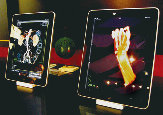 最後に,2010年11月に開催されたRSNA 2010のAZE社ブースで発表されていた「AZE VirtualPlace FOMULA」シリーズ(図3)は,超高速画像処理技術を搭載し,表示処理速度が従来比約20倍と飛躍的に向上した。心臓領域では,4D表示を高画質のまま方向変換して観察することでき,今後のクライアント側での表示・処理のさらなる高速化が期待された。また,AZE社はiPad用WSアプリ(図4)を開発しており,AZE VirtualPlace FOMULAシリーズとの組み合わせにより,さまざまなシーンでの3D画像活用の可能性が期待された。