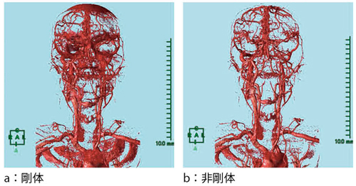 当院の頭部CTAでは,全例サブトラクション処理を行っている。AZE VirtualPlace 雷神導入当初,サブトラクション機能の特長として剛体位置補正ができることが,ほかにはない非常に有用な機能であった。2010年にWSを更新した際,サブトラクション機能に新しい位置補正が加えられていた。それは非剛体での位置補正である。この非剛体位置補正は,剛体位置補正にはない“ひねり”に対しての位置補正が可能なことが特長で,さらに動きに強くなっていると感じられた(図1)。よって,これまで頸部CTAの処理は他のWSで行っていたが,この非剛体位置補正が加わったことにより,頸部CTAもAZE VirtualPlace Plusで処理するようになってきている。