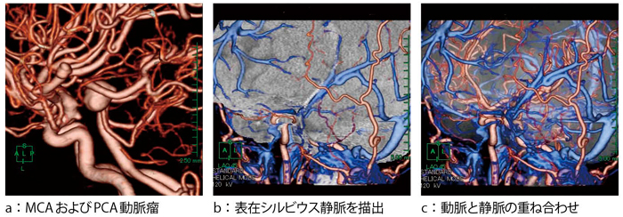 図2は,頭部血管動脈瘤の症例で,動脈瘤の位置・形態の把握のほかに,当院では静脈画像を作成し,手術アプローチに対するシミュレーションを行っている。サブトラクション処理で注意しなければいけないことは,処理を加えることにより元画像よりも少し画像が劣化する点で,より細部まで観察したい場合は元画像にてフォローすることが必要である。