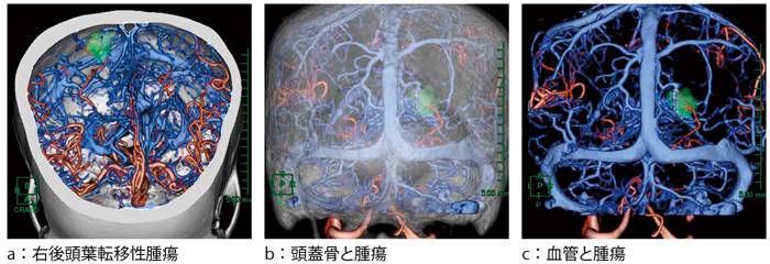 図3は,転移性脳腫瘍の症例である。腫瘍に対してのfeederが確認でき,静脈・頭蓋骨を加えることで有用な術前シミュレーション画像となる。