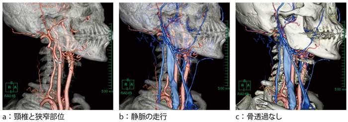 図5は,頸動脈のCEA術前シミュレーション画像で,頸椎と狭窄部位の位置関係を把握するのが主である。脳神経外科医の要望で静脈画像を描出してみたが,この画像に関しての有用性は医師によって賛否両論であり,有効活用の是非を現在模索中である。