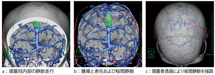 図6は,頭頂部髄膜腫の症例である。上記の転移性脳腫瘍と同じようなシミュレーション画像であるが,よく見ると,頭蓋冠の内板と外板の間から静脈が出ているのが観察できる。これは板間静脈と言い,この症例では板間静脈が非常に発達している。よって,この画像から板間静脈を傷つけることなく開頭しなければいけないことがわかり,開頭位置のシミュレーションに非常に役立った。頭蓋冠の内部を走行するような血管であるため,サブトラクション処理なくしては描出できなかった一例である。