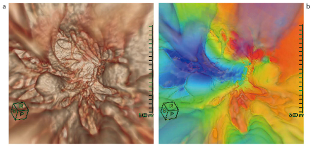 バチスタ原法のコンセプトを残し,安全性を高める改良術式が新たに考案された。その1つが,前・後乳頭筋基部を左室後壁側で縫い寄せ,左室径の短縮と乳頭筋の機能改善をもくろむ乳頭筋近接術である。他の1つが,左室壁に切開を加えた後,拡張に伴い菲薄化した壁は切除せず,重ね合わせることで壁厚と収縮性を改善させるオーバーラッピング縮小術である。僧帽弁中央より左室心尖部を内視鏡モードで観察することで,乳頭筋のオリエンテーションが容易となる(図5 a)。左室縫小術は,拡張型心筋症だけでなく,虚血性心筋症の末期心不全にも適応される。虚血性心筋症の場合,心筋障害・残存機能に偏在性があるため,CTによる立体構造解析に,心筋SPECTによる心筋機能評価を加えたフュージョン像(図5 b)がきわめて有効となる。セグメンテーション後のオパシティ操作と内視鏡モード(図4 b)にて,冠動脈走行と乳頭筋の位置を確認し,症例によってはCTとSPECTのフュージョン技法による心筋機能評価を追加することで,心臓外科医がバチスタ手術で最大の難題とする左室壁の至適切開部の決定が可能となる。
